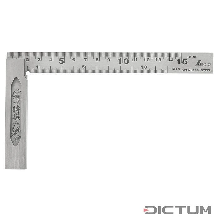 Équerre de précision à graduation en mm des deux côtés, mesure intérieure et extérieure. Épaulement décoré de motifs japonais. Acier inox. Précision 0,1 mm sur 100 mm