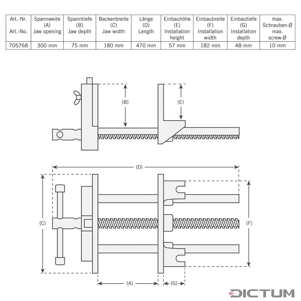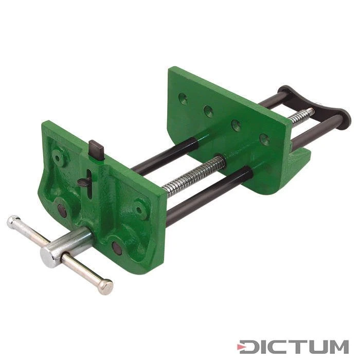 Pince en métal à guidage double, broche à filetage trapézoïdal et valet coulissant. Vissage sous le plan d’établi (hauteur de montage 60 mm), alésages de mâchoires pour cales en bois.