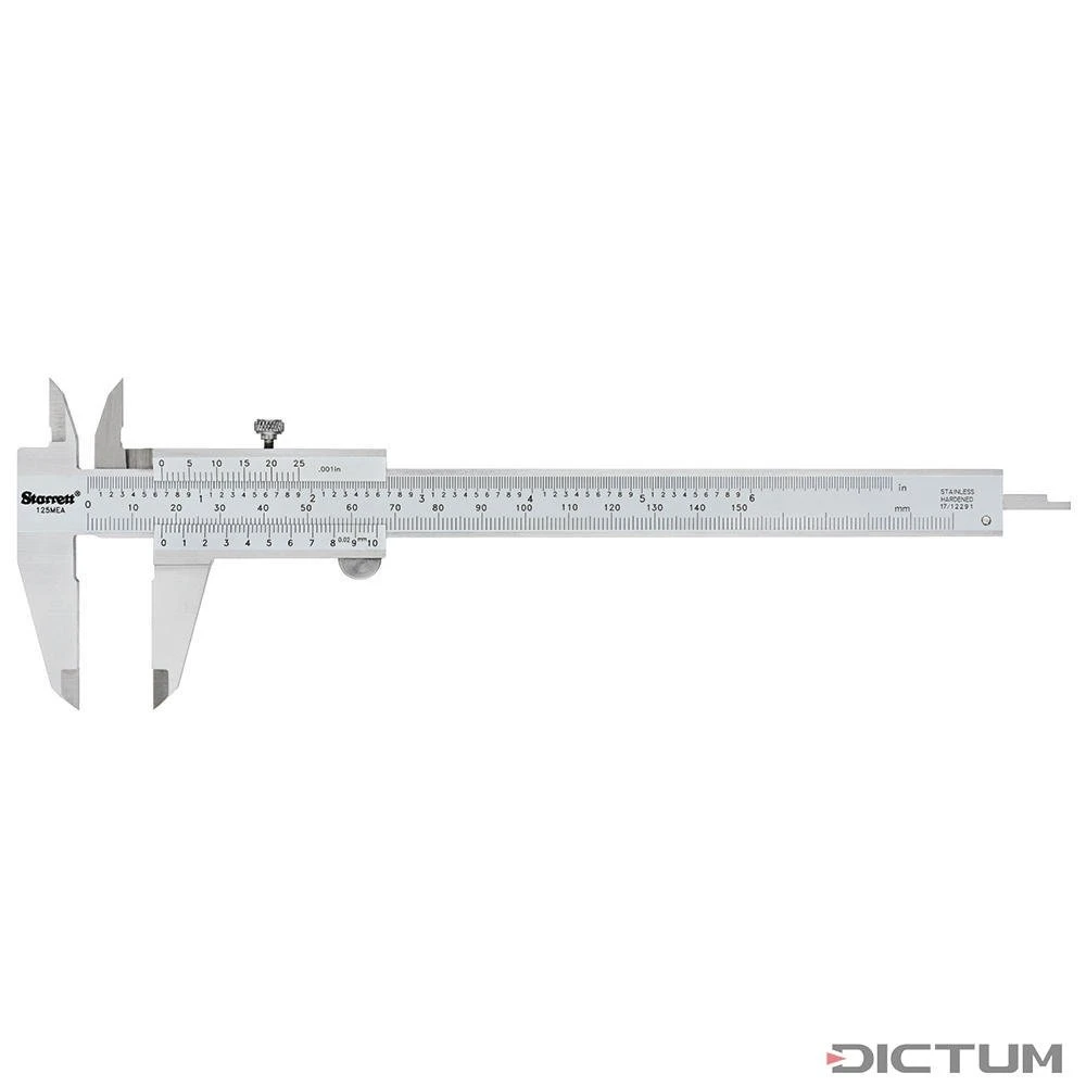 Pied à coulisse de précision de la marque Starrett se caractérisant par son exactitude de mesure de ± 0,02 mm. La graduation est antireflet et gravée en profondeur en mm et en pouces. Curseur en acier inoxydable avec vernier de 0,02 mm et vis de blocage.